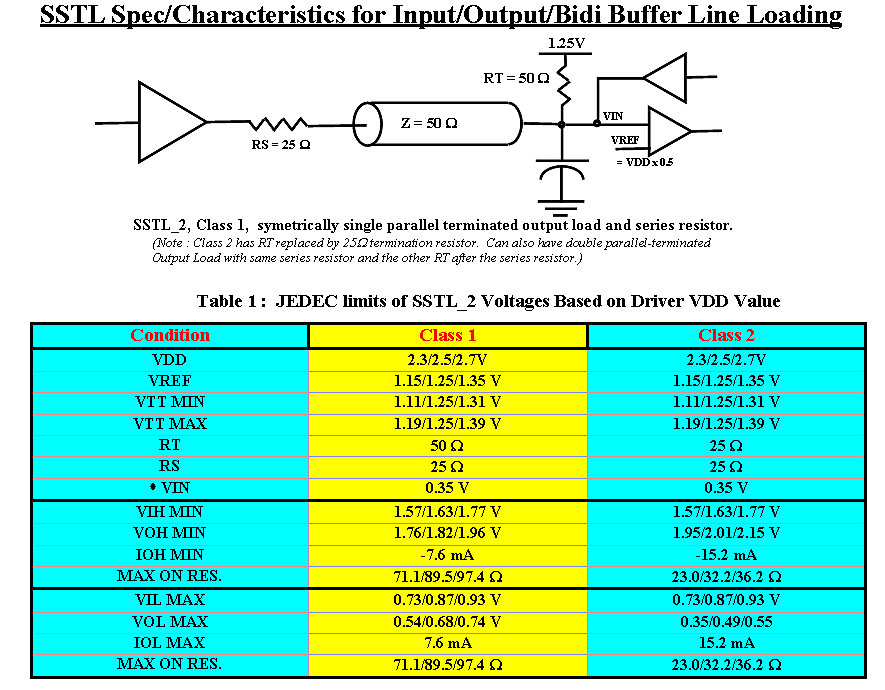 This table shows the SSTL spec for voltages, current and resistance for Class 1 and Class 2 SSTL buffers. Schematic shows hookup with loading & termination.