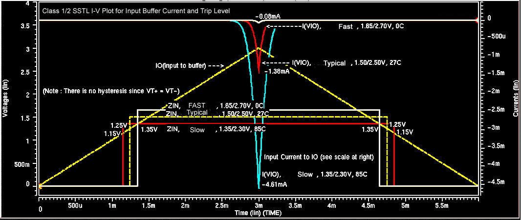 B) SSTL IV PLOT FOR INPUT DC TRIP LEVELS This plot shows I-V curve (best/typical/worst case) for Class 1 and 2 bidirectional SSTL buffer when tri-stated, and port “IO” is used as input buffer with “ZI” as the buffered signal. Input voltage trip levels are also shown, and are measured to be the same as VREF = VDD/2. These trip levels fall between VIL(max)=0.93V and VIH(min)=1.57V listed in Table 1, Page 4, and play an important role in ground bounce noise immunity where the input noise trips the input stage and results in oscillations fed back to output stage. (SSTL DC TRIP POINTS: Click image to enlarge)
