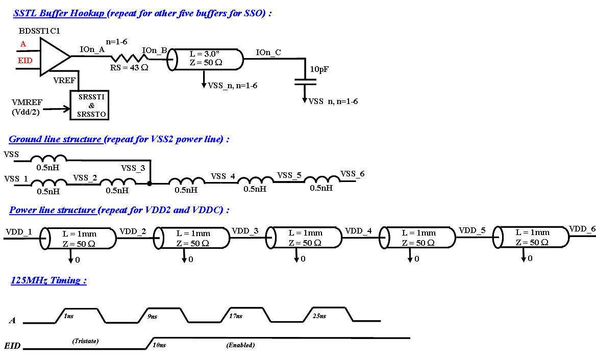 The next step is to add drivers (voltage sources) to the simulation to switch the desired buffers. For example, one setup may have six of the seven outputs switching together while the 7th output is biased to remain low (at Logic-0). During switching we can monitor the effect of the six SSO outputs on the quiet output as shown in the next section's SSTL noise simulation. That particular setup had up to 870mV spikes on the quiet output which was biased at Logic-0. In addition to monitoring the quiet output, voltage and current levels should be measured at the input and output of each I/O buffer as shown in the next schematic to help understand the cause of noise and ground bounce. By iterating these simulations, an optimal hookup can be determined with minimal noise. This result can determine: