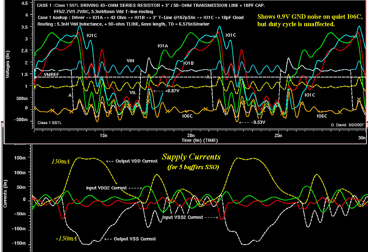 These plots are for SSTL Bidirectional buffers used in a ASIC to Memory interface to simulate the effects of noise on the output's duty cycle. Voltage and current waveforms are shown for five buffers switching simultaneously (SSO). Hookup is for Class-1 and Class-2 buffers driving 43Ω series resistor; 3" transmission line; and 10 pF termination load.