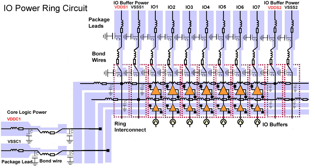 Noise and ground bounce failures are mainly cause by multiple simultaneously switching outputs (SSO). Since Input/Output (I/O) buffers are larger than core logic standard cells, they are usually placed around the perimeter of the chip. Noise occurs from the large switching currents passing through the pad bond wire and package lead inductances. Accurate SPICE simulation of the IO ring for SSO and ground bounce requires insertion of the IO ring RLC parasitics (as well as mutual inductance "M"), all the I/O buffers, and the package model. Noise occurs when many output buffers switch together causing large voltage spikes. If there are insufficient power and ground pins, unstable voltage can occur at the I/O buffers. Another problem cause by package parasitics is inductive crosstalk induced delay between the I/O signals having closely spaced package traces. To set up SSO SPICE simulations one needs to make RLC models of the package and power ring traces. Unfortunately most parasitic extraction tools do not extract inductance (L), and these inductances need to be modeled by hand if they cannot be extracted. The following schematic takes all these considerations into account. Across the top we have a set of VDD/VSS pads on the left, followed by seven I/O pads, and another set of VDD/VSS pads on the right. The VDD/VSS supplies on the top are wired to the outermost power rings, which deliver power only to the I/O buffers. The VDD/VSS supplies on the left side are connected to the innermost power rings, which supply power to core logic and standard cells. This structure is what needs to be simulated
